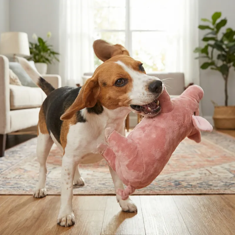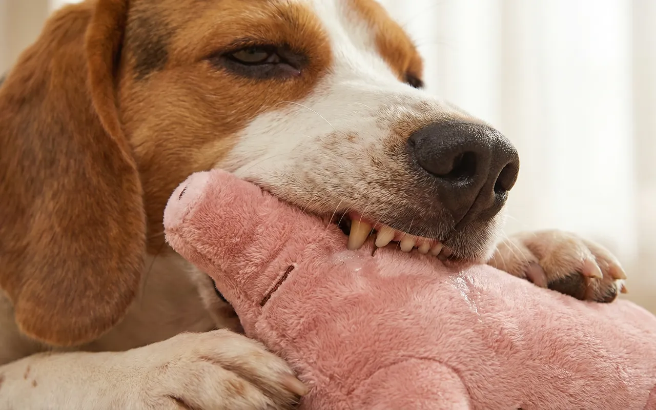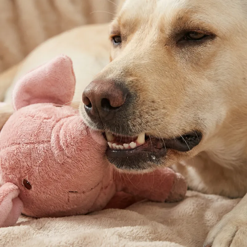 Our young dog used to chew shoes, now he sticks to this plush pig. It keeps him focused, and his breath even smells better.