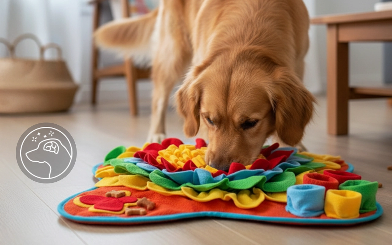 Our dog gets bored easily, but this puzzle mat keeps her sharp. She spends ages sniffing out kibble.