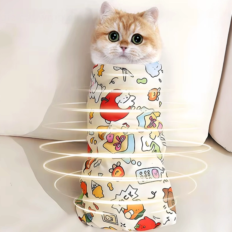 Bath time used to be chaos, but now my cat is calm in this wrap. The self-stick part holds everything in place so well. Even the pattern makes me smile.
