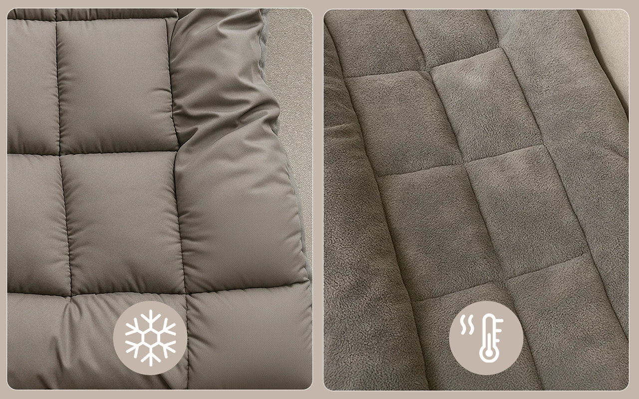 One side keeps things cool through warmer months. Flip over for a snug surface when winter arrives at home.