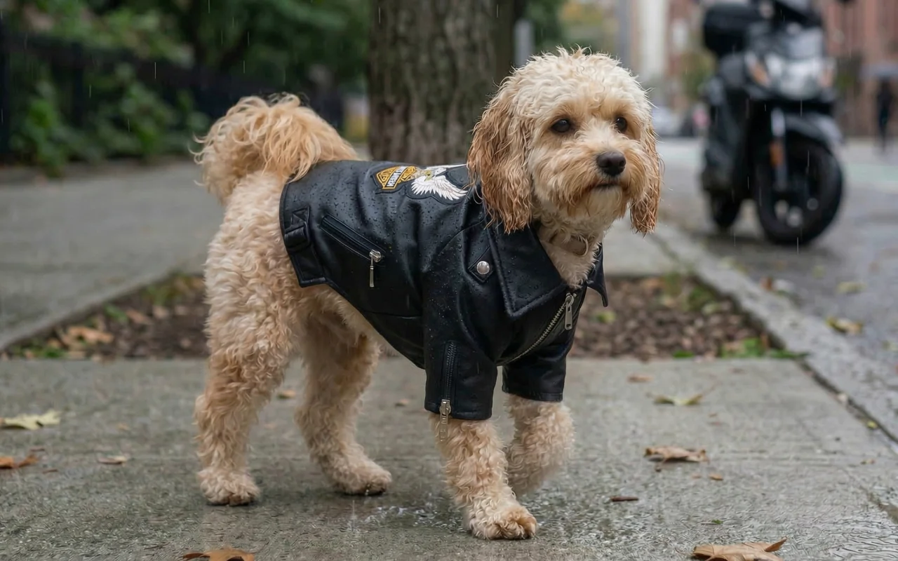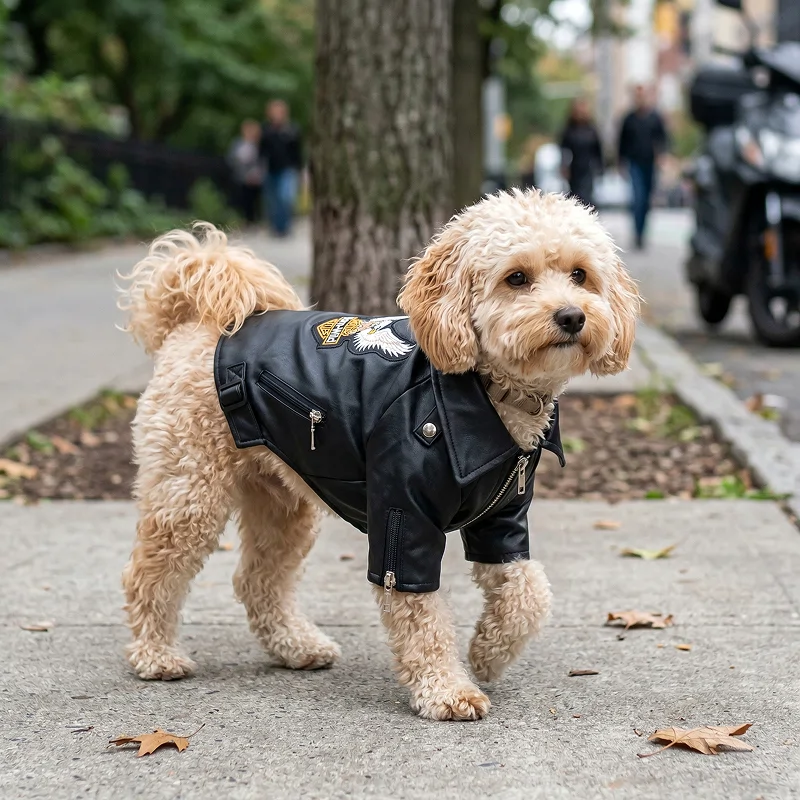 Got this little leather jacket for my dog and he struts around like a movie star. Keeps him dry on rainy walks and wipes clean easily.